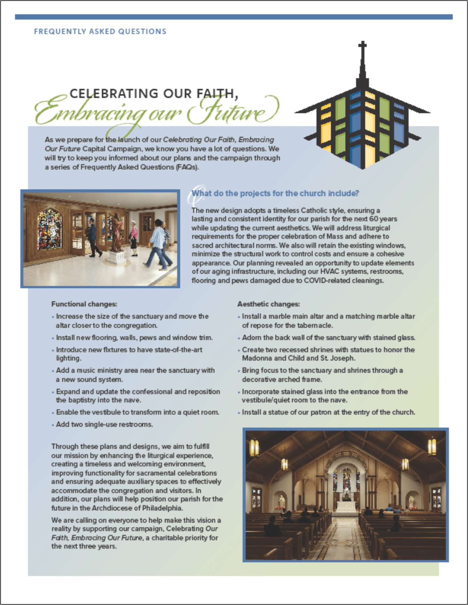 As we launch our Campaign, we are excited to share this brochure that contains the plans for our project, click the booklet below for a page-by-page view. We know you may have additional questions and so we will try to keep you informed about our plans and the campaign through a series of Frequently Asked Questions (FAQs) and Info Insights listed below.